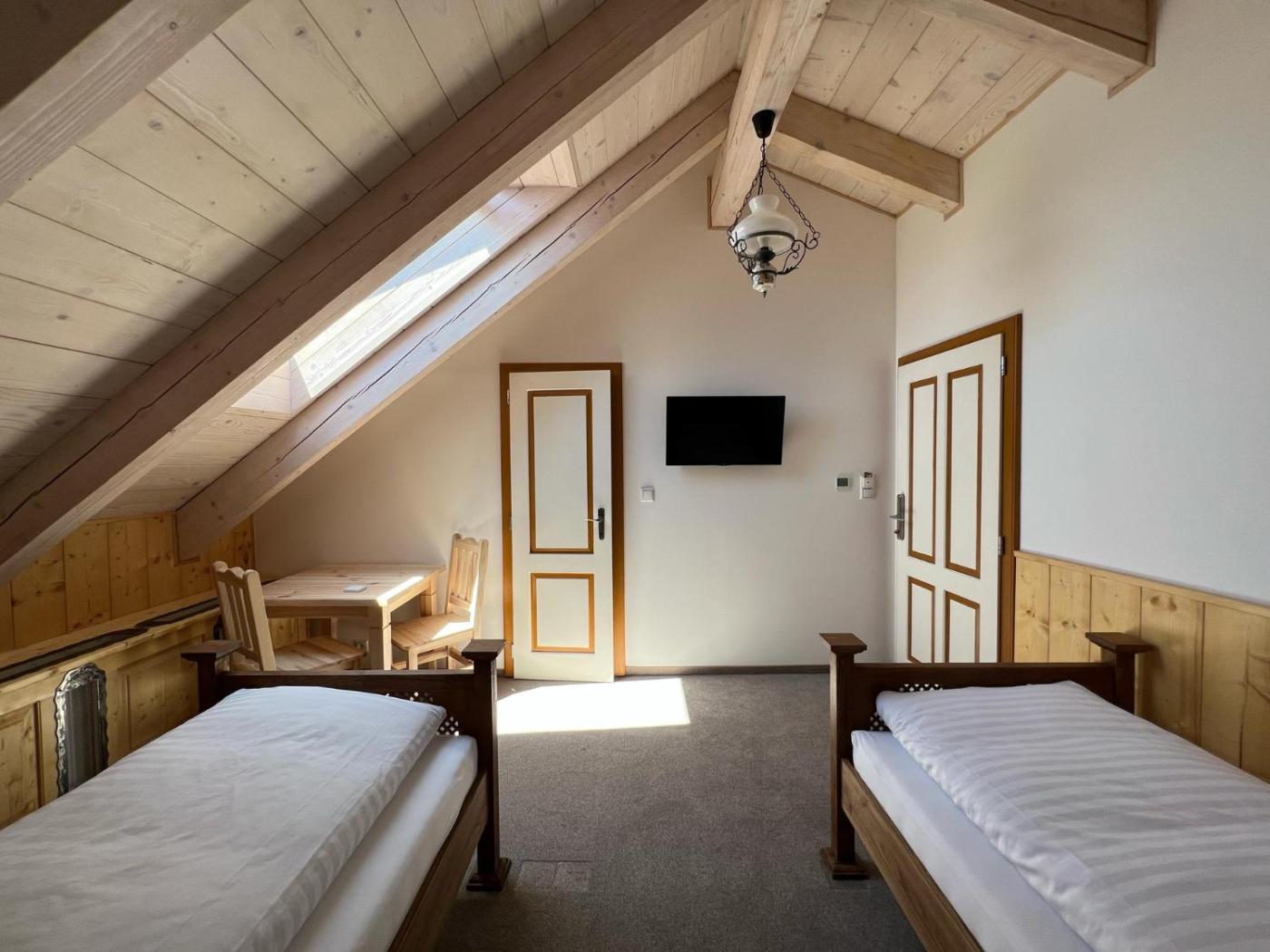 Triple Room. The spacious triple room provides a tea and coffee maker, a wardrobe, as well as a private bathroom featuring a shower and a hairdryer. The triple room is equipped with a flat-screen TV, a sofa, a carpeted floor, as well as heating. The unit offers 2 beds. ;